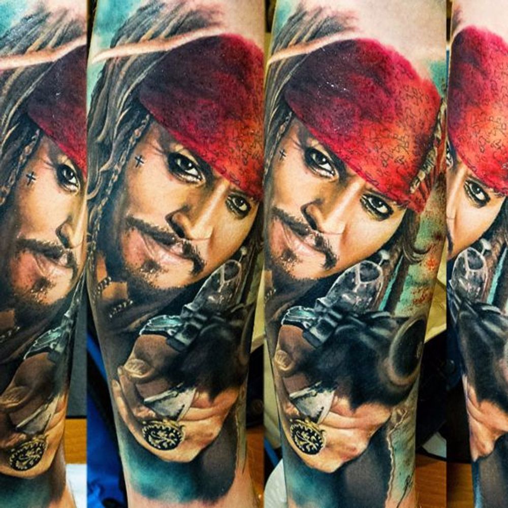 Captain Jack Sparrow Tattoo by Zsofia Belteczky #JackSparrow #PiratesoftheCaribbean #PiratesoftheCarribeanTattoo #PirateTattoos #DisneyTattoos #MovieTattoos #ZsofiaBelteczky