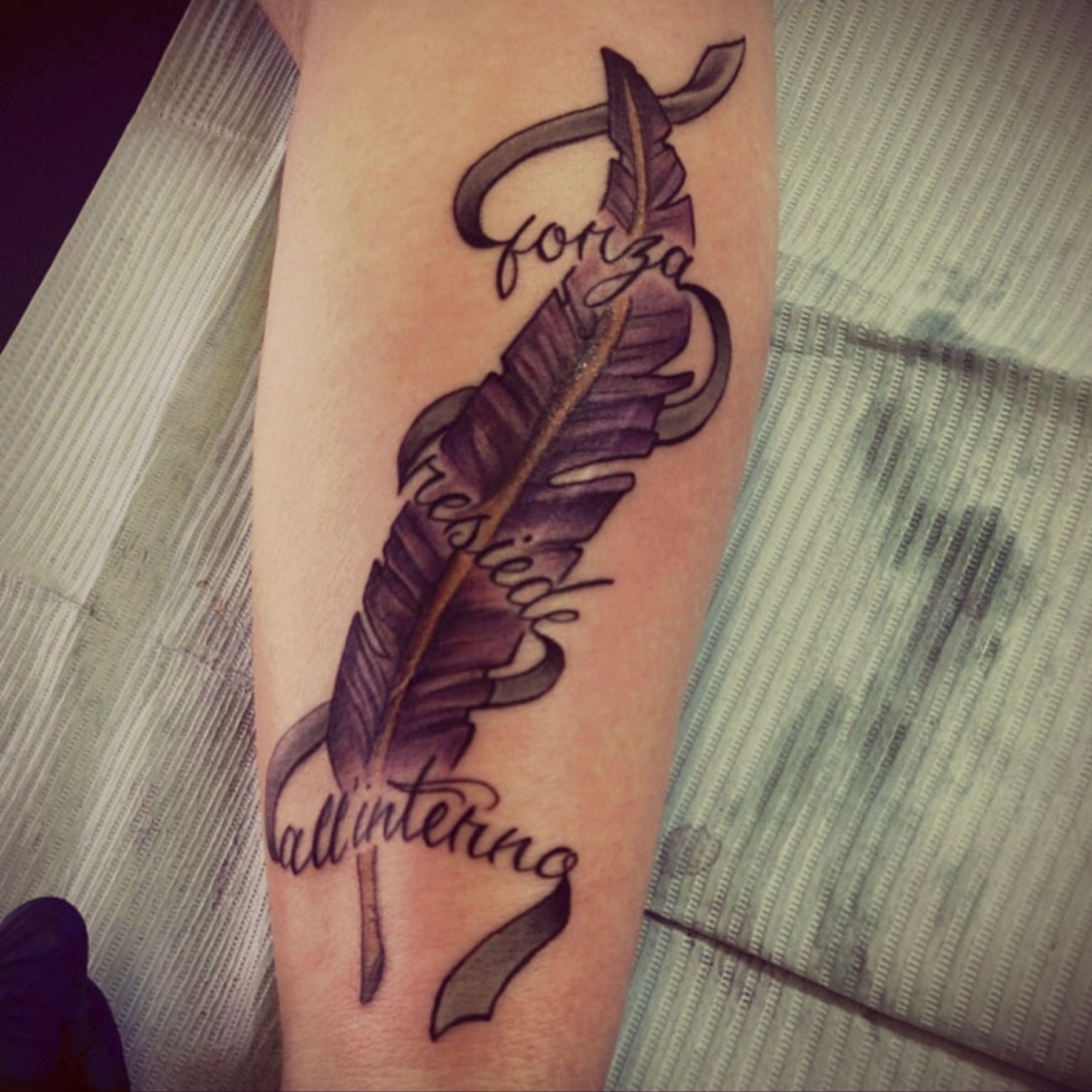 Tattoo artist's original design for me to cover self defense scars , Italian: Strength lies within... From ex trying to kill me. I win!!! Artist: Jakes Tattoo and Flash Farmingto NM