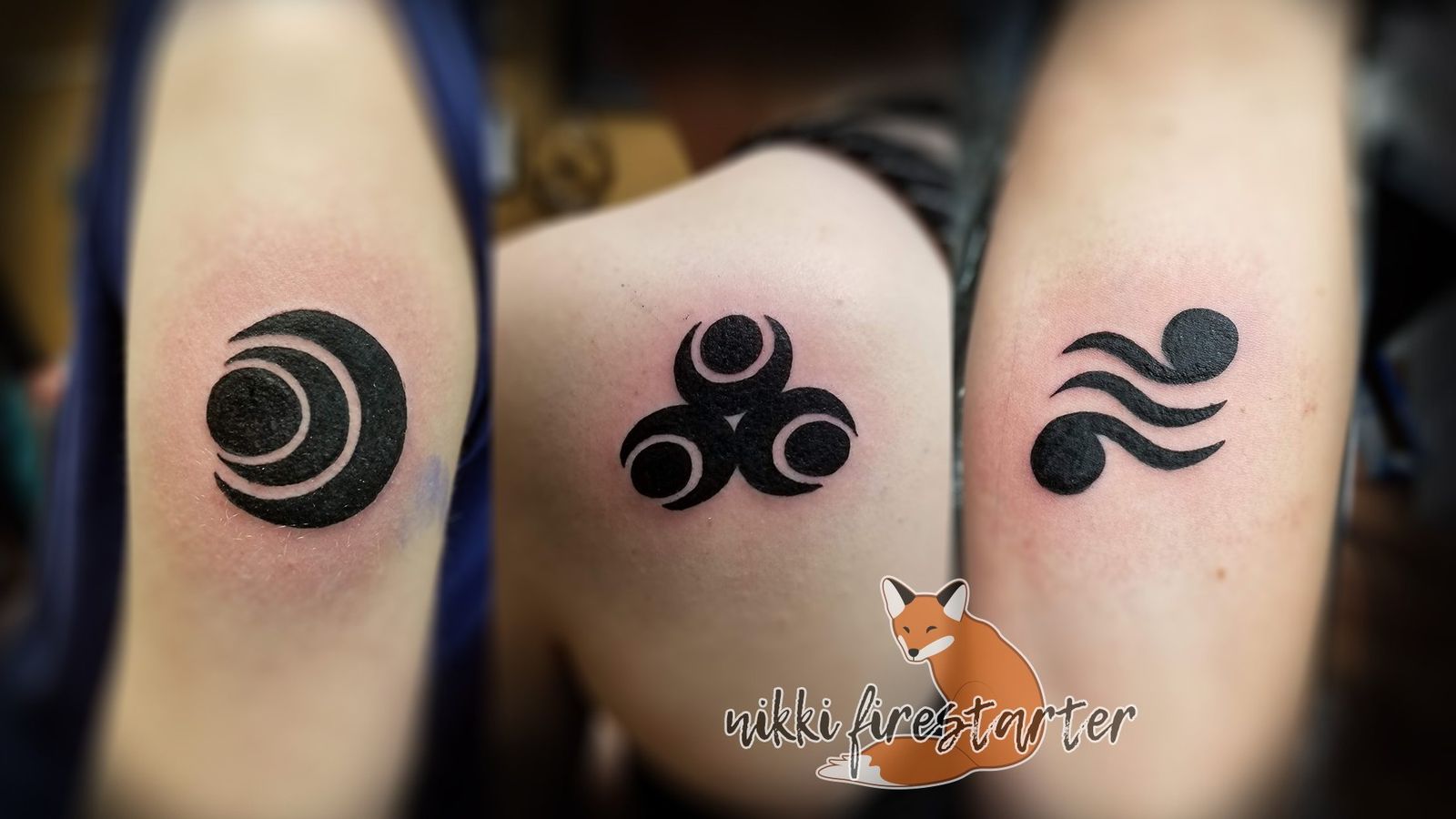 Some simple Wind Waker pearls for a set of sibling tattoos! In order: Upper arm, shoulderblade, upper/inner forearm. nikkifirestarter.com #legendofzelda #windwaker #pearls #elementalpearls #blackwork #blacktattoo #solidblack #symbols #graphicart #graphictattoo #tattoo #bodyart #bodymod #ink #art #nonbinaryartist #nonbinarytattooist #mnartist #mntattoo #visualart #tattooart #tattoodesign