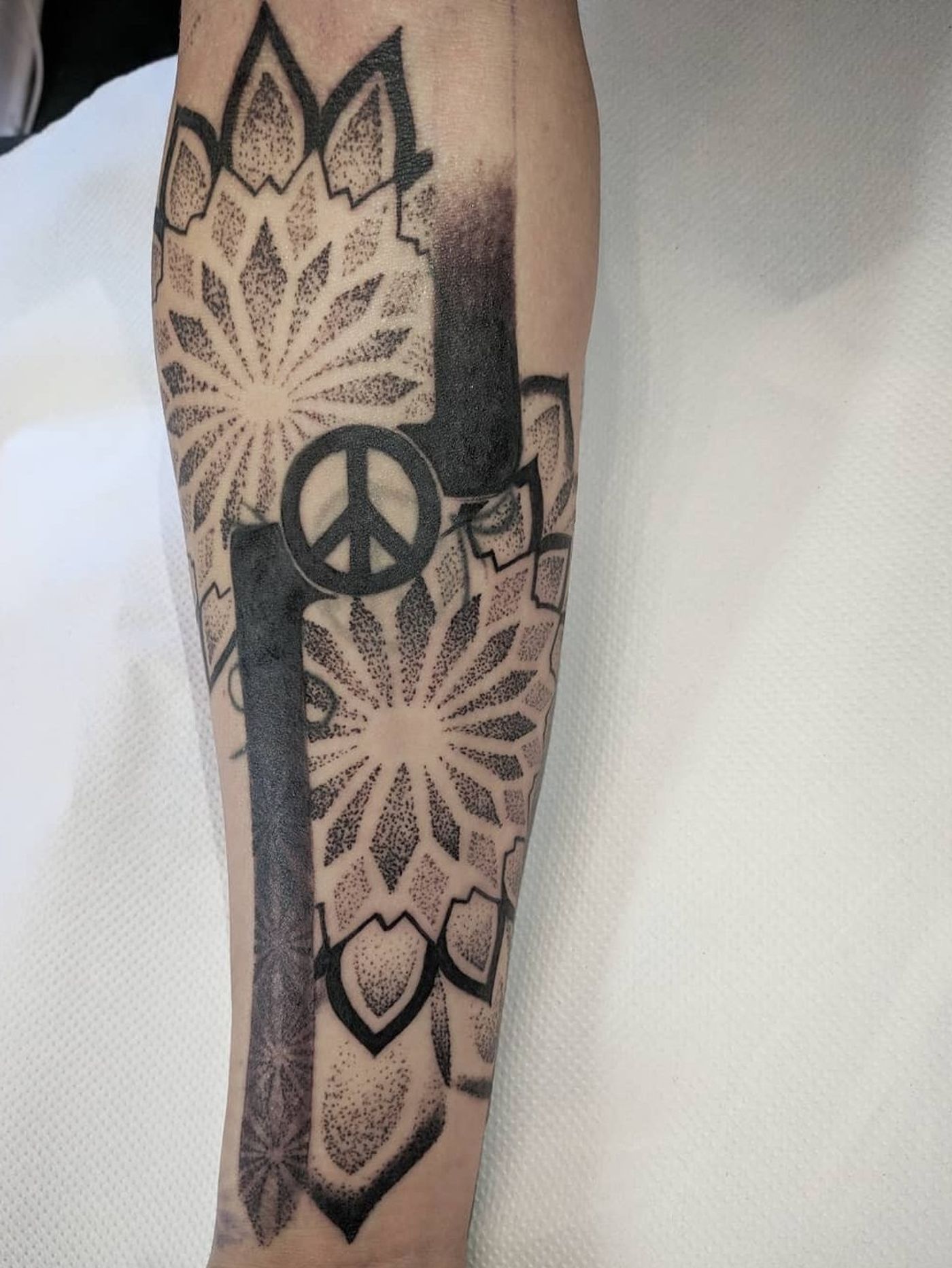 Cover-up and reworked/incorporated the existing peace sign #dotwork #gloucester #gloucestershire #cheltenham #geometrictattoo #coverup #needledrag #peace #peacesign #blackwork #armtattoo