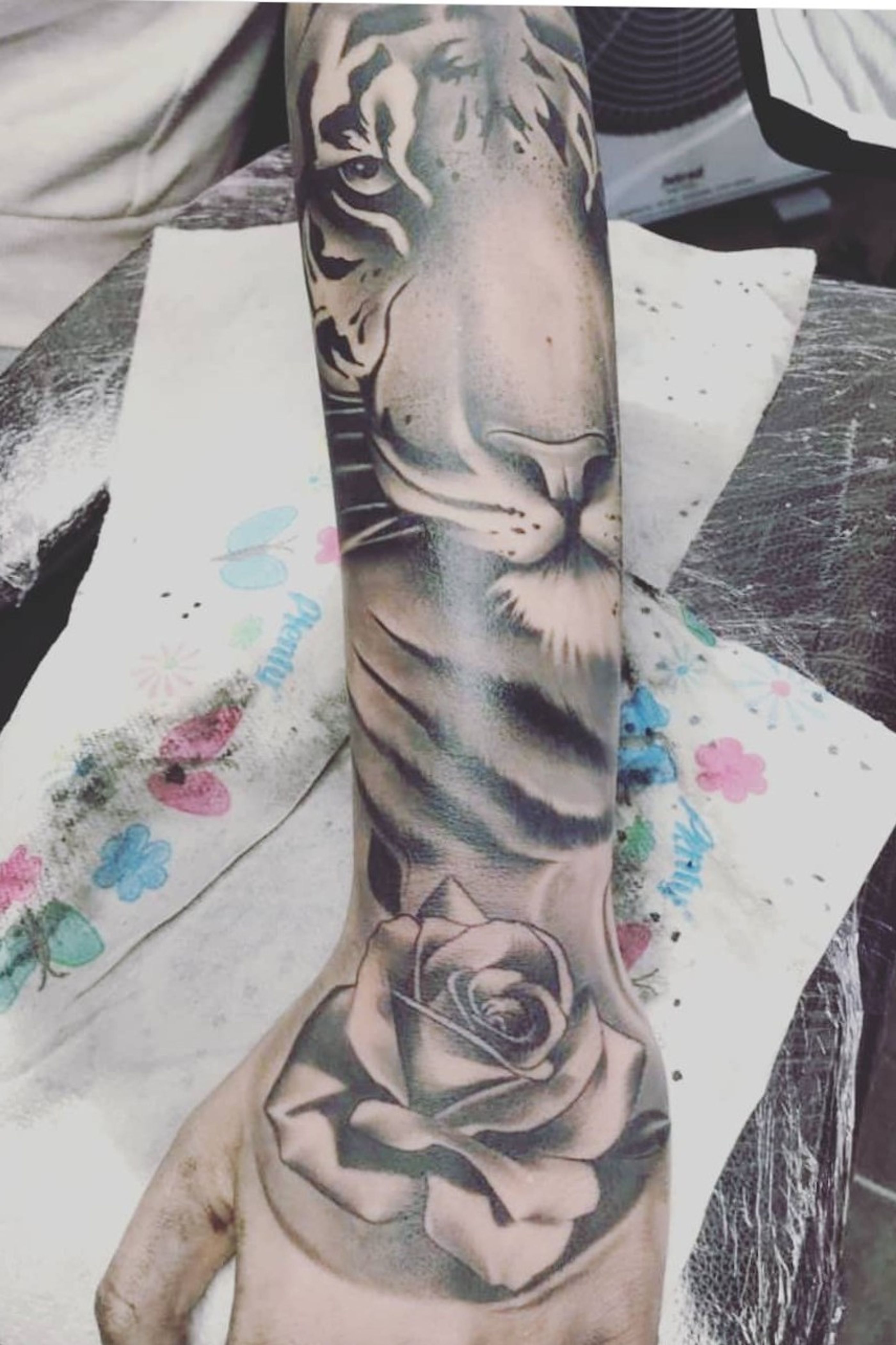 Realistic tiger with a realistic rose sleeve