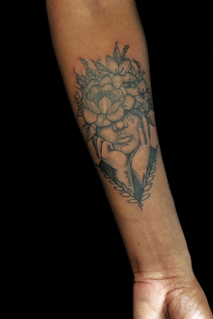 Blackwork, face tattoo, floral face, fineline, religious tattoo