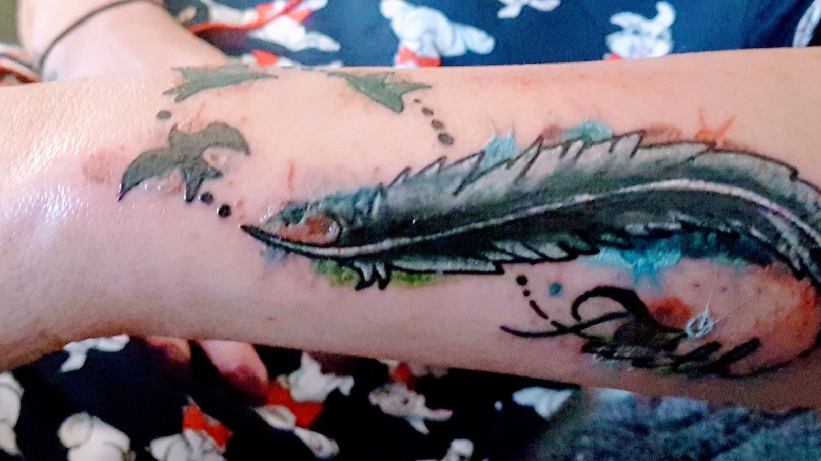 This was cover up a feather, 3 Birds amd the word Faith all pit together in a infinity symbol