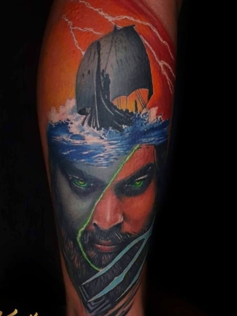Aqua Man Tattoo - Kamikaze Tattoo Studios #kamikazetattoostudio #balitattoo #balitattoos #balitattooshop #balitattoostudio #balitattooartist #canggu #canggustudio #canggutattoo #worldfamousink #customtattoo #customdesign #colortattoo #sleeve #aquaman #aquamantattoo
