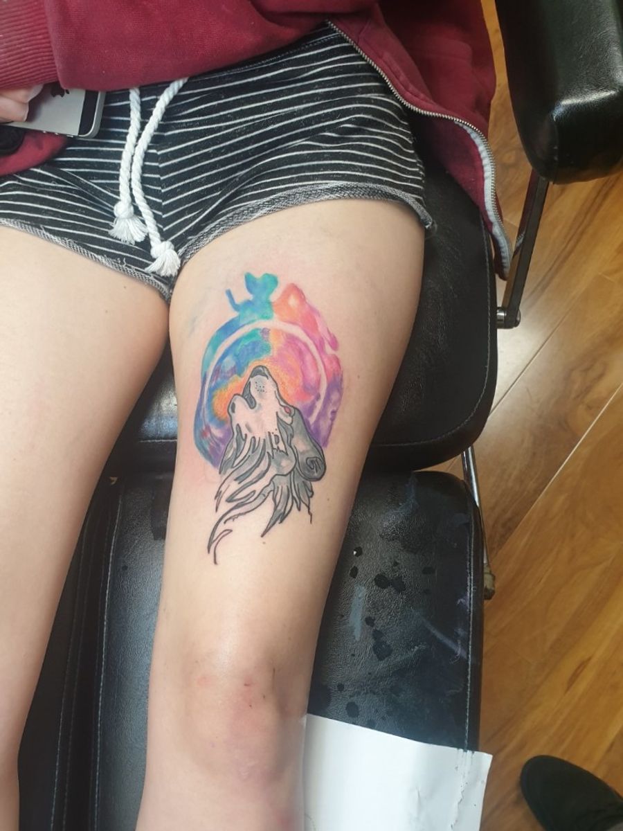 So the same customer who had the #watercolour #elephant got this watercolour wolf on their thigh. #colourtattoo #girly #coloursplash #tattoo #wolfhead #colours #animals #wolf #creative #colourful #watercolour #howlinwolf #thightattoo #colour #watercolortattoo #animaltattoo #thigh #shoreham #lancing #brighton