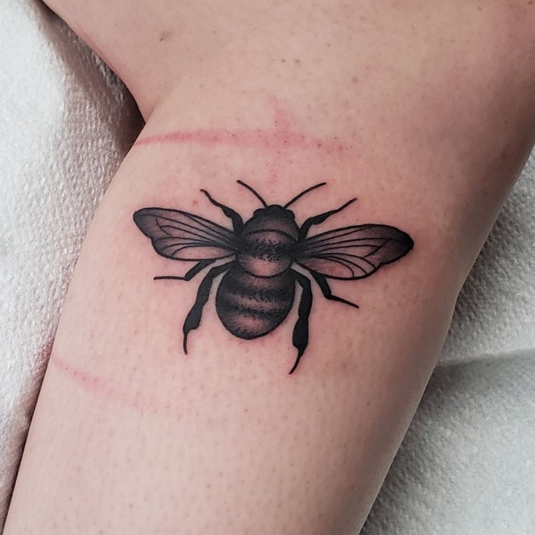Bee Tattoo . . . . #tattoo #tattoos #tattooartists #tattooartist #dfw #dallas #denton #lewisville #blackandgrey #blackwork #blackworktattoo #bee #nature #beetattoo